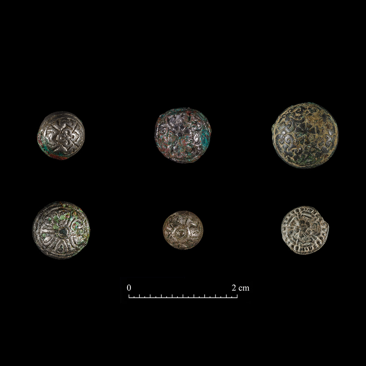 There are several examples in the collection of metal doublet buttons (a bulbous form of button from the 17th century that would adorn garments such as doublets, jerkins, and breeches) with additional decorative features. About half are comprised of tinned copper alloy and the other half are made of nickel alloy. The most common thematic motif among these buttons is floral or botanical, with eight of the twelve unique motifs fitting into those categories. Other motifs include scroll work, stars, and more geometrical examples. A few of the styles have multiple matching buttons, though never in quantities of more than two or three. While the vast majority of these are cast-relief, there is a single example of an inscribed (engraved) decoration.