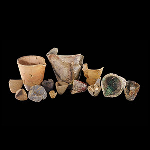 One large vessel is identified as a melting pot. Covered on the interior and exterior with thick residues, this large ceramic may have been part of similar metallurgical or glassmaking efforts on the site.