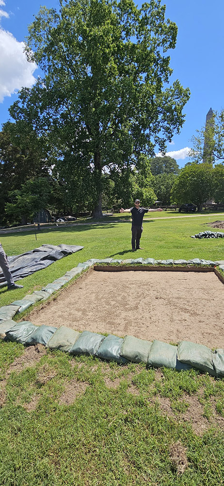 As opening day of the 2025 Jamestown Field School approaches the archaeology team is preparing the various excavation sites that they’ll be working on. One is a potential brick-lined cellar to the north of the Memorial Church that was discovered in 2023 by ground-penetrating radar (GPR). This feature is right in the middle of property known to belong to John Howard in the late 17th century. The identification of his property is part of an ongoing project studying Jamestown land patents and matching them to the excavated landscape. John Howard’s initial land patent, dated April 10, 1694, described his property as bordered by the churchyard to the south and the Great Road to the east. By examining excavations from the previous 31 years of the project, Senior Staff Archaeologists Mary Anna Hartley and Anna Shackelford identified a number of ditches and fence lines that match the survey measurements on John Howard’s land grant. Previous archaeology had also uncovered portions of the Great Road northeast of the Church, allowing the team to place Howard’s property on the landscape.