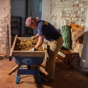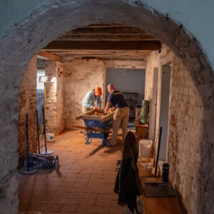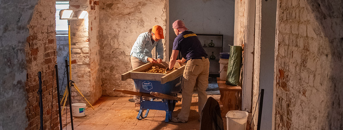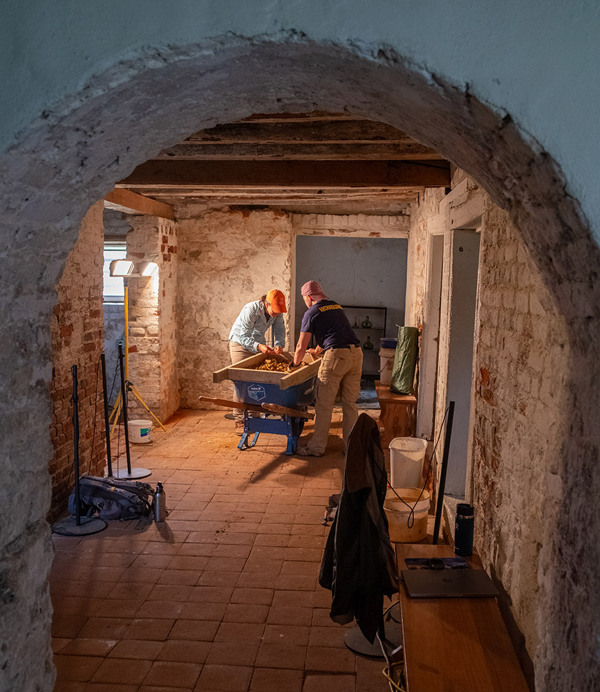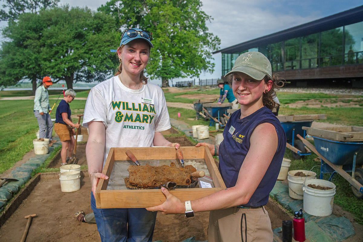 - Senior Staff Archaeologist Mary Anna Hartley and Staff Archaeologist Caitlin Delmas screen through soil excavated from Bacon’s Castle’s cellar.