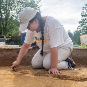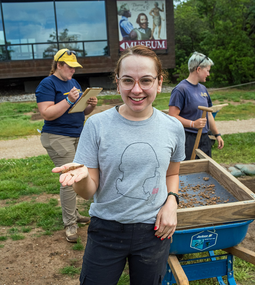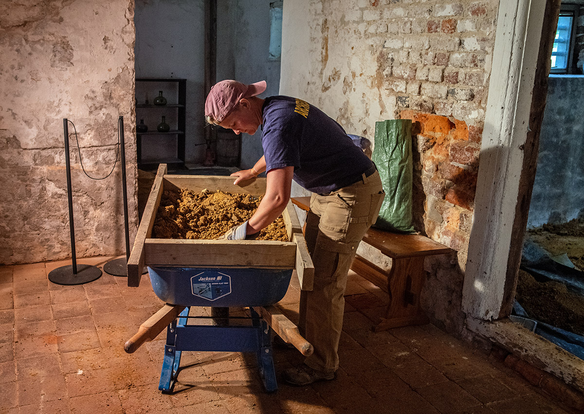 - Staff Archaeologist Cailtin Delmas looks for artifacts in soil excavated from Bacon’s Castle’s cellar.