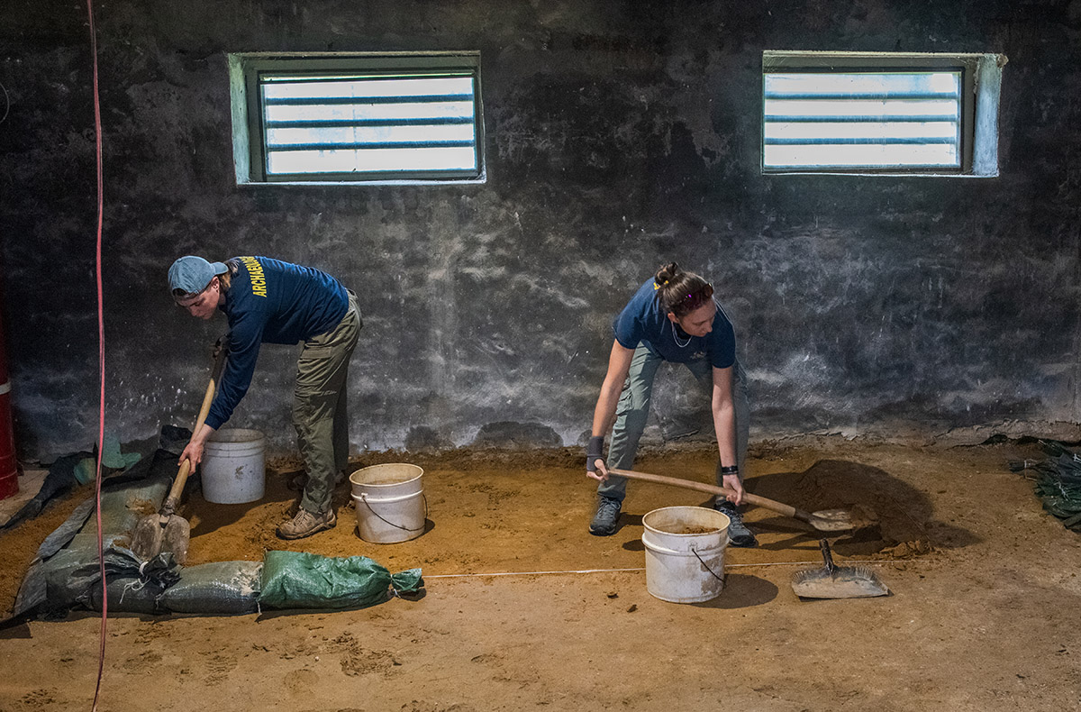 - Staff Archaeologist Natalie Reid and Senior Staff Archaeologist Anna Shackelford excavate a square in the cellar of Bacon’s Castle.