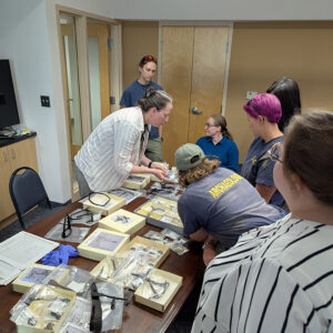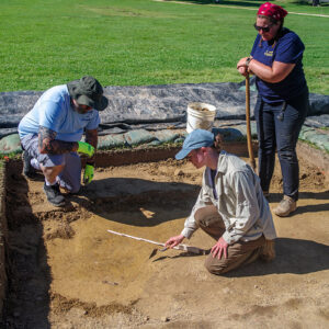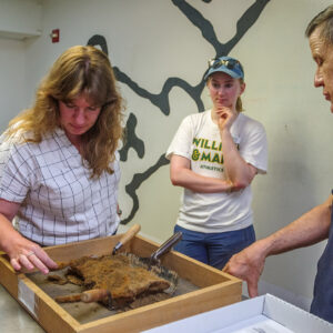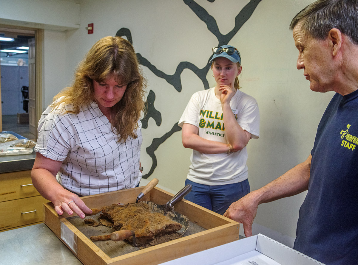 - Senior Curator Leah Stricker, Development Writer Janne Wagner, and Conservator Don Warmke discuss the iron object Janne found during one of the staff dig days. Janne was an attendee of Jamestown’s 2023 Field School.