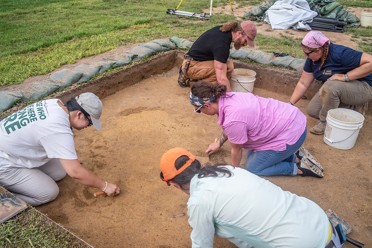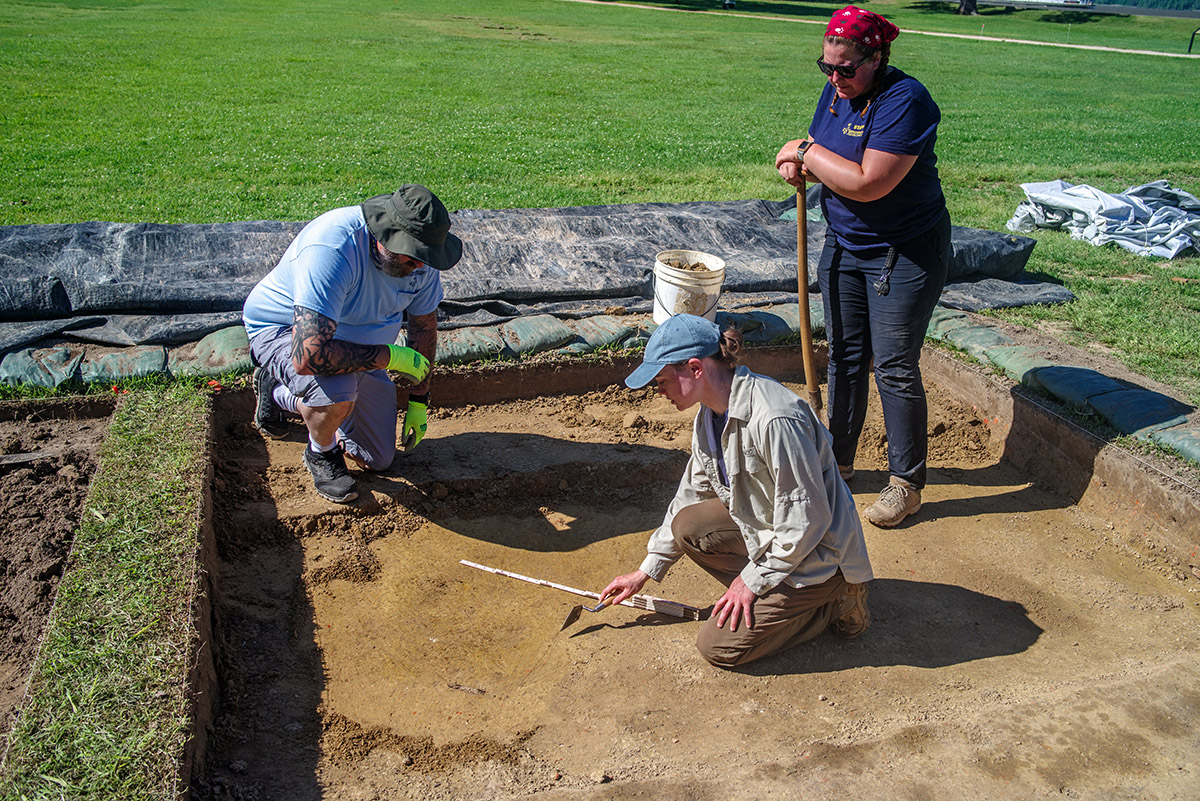 - Aaron McKee of the grounds and maintenance team watches Staff Archaeologist Natalie Reid score a burial found south of the Archaearium on a staff dig day. Archaeological Field Technician Hannah Barch looks on.