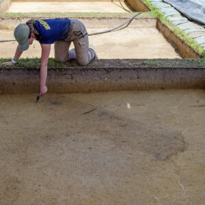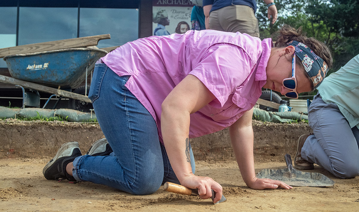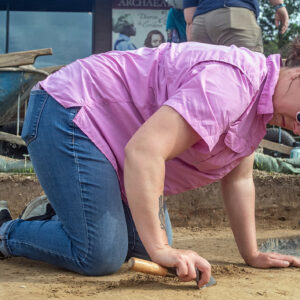 - Development Assistant Korinne Young carefully trowels away south of the Archaearium during one of the staff dig days.