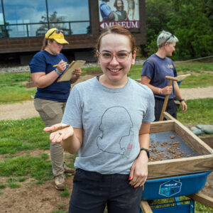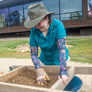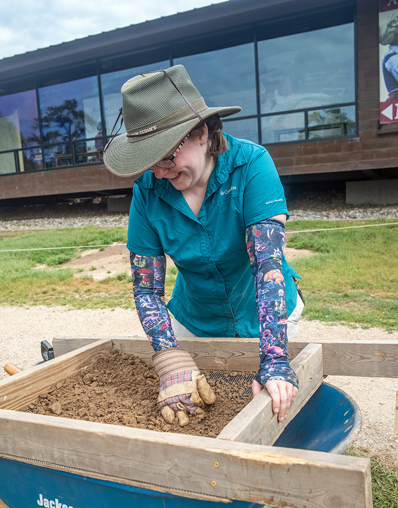 - Office & Development Administrator Katie Kowicki screens through soil just south of the Archaearium during one of the staff dig days.