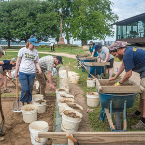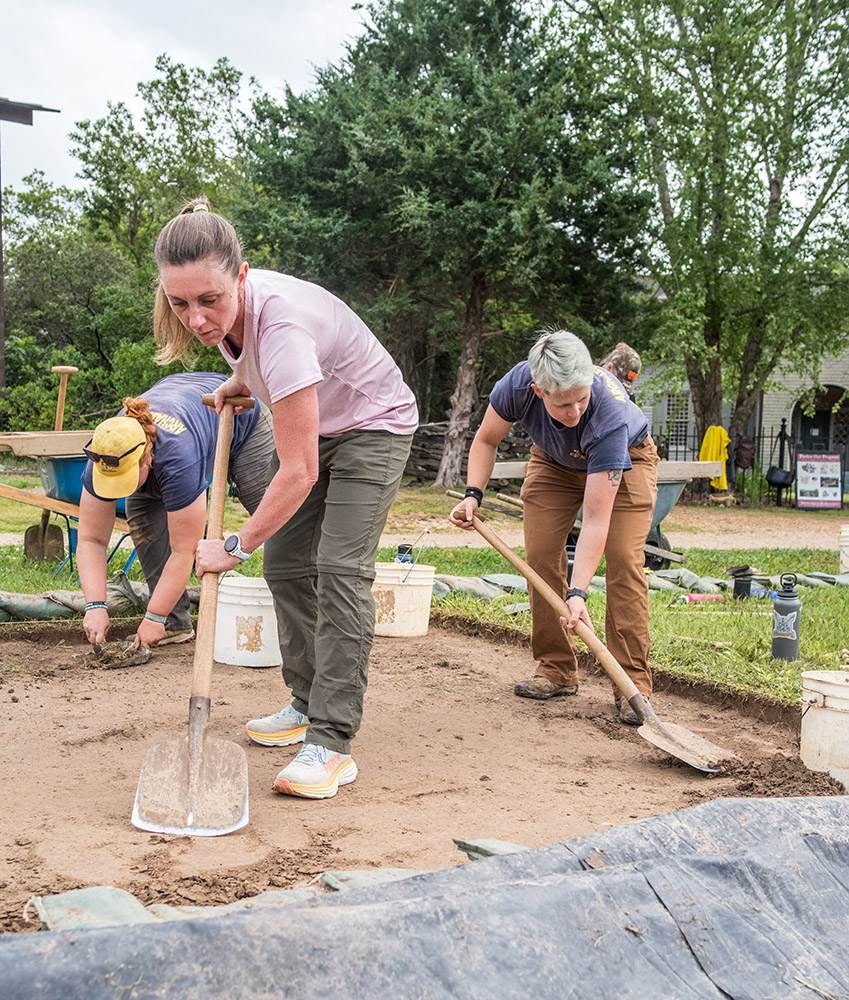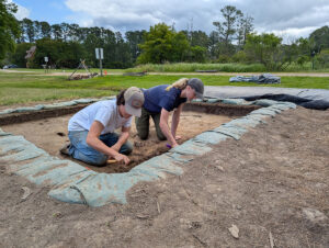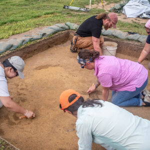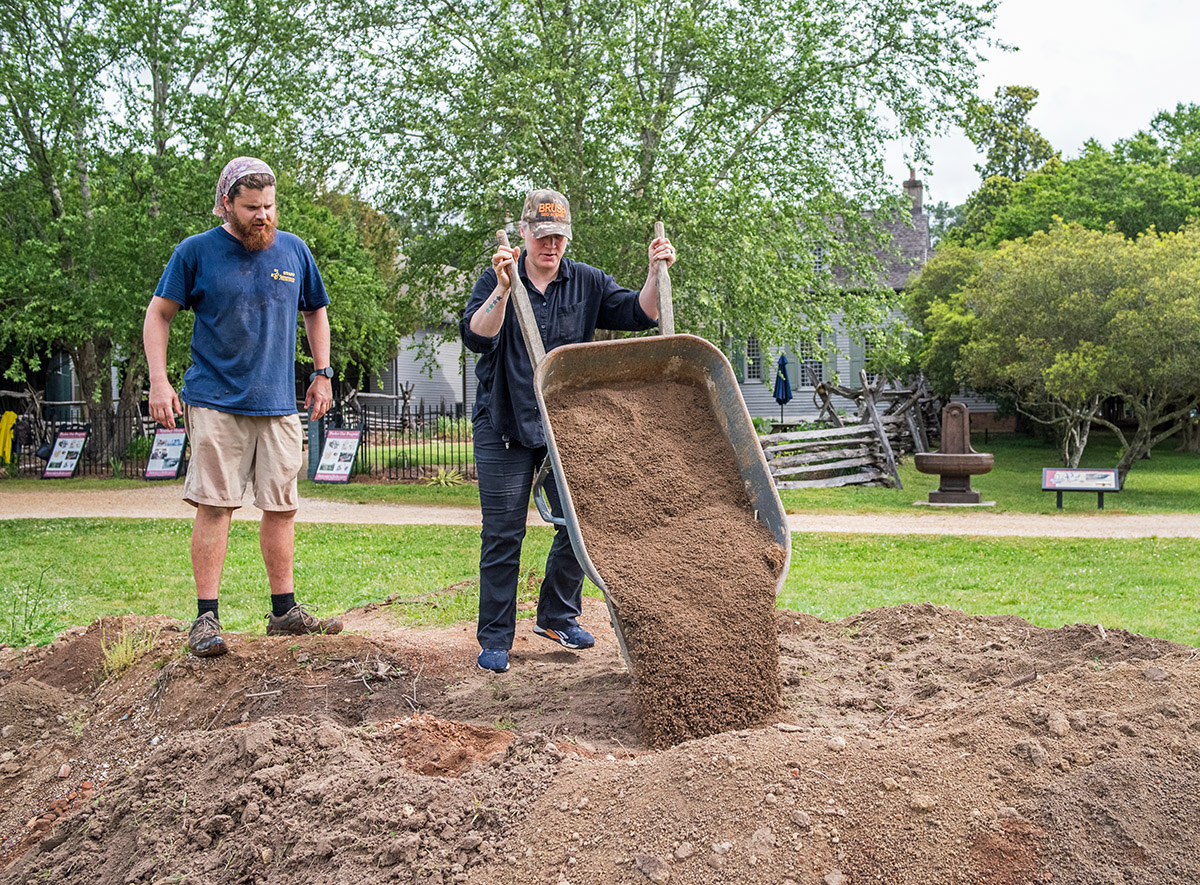 - Korinne Young and Emelia Robertson, both members of the development team, and carpenter Jesse Robertson join Senior Staff Archaeologist Mary Anna Hartley and Archaeological Field Technician Hannah Barch in excavations on one of the staff dig days.