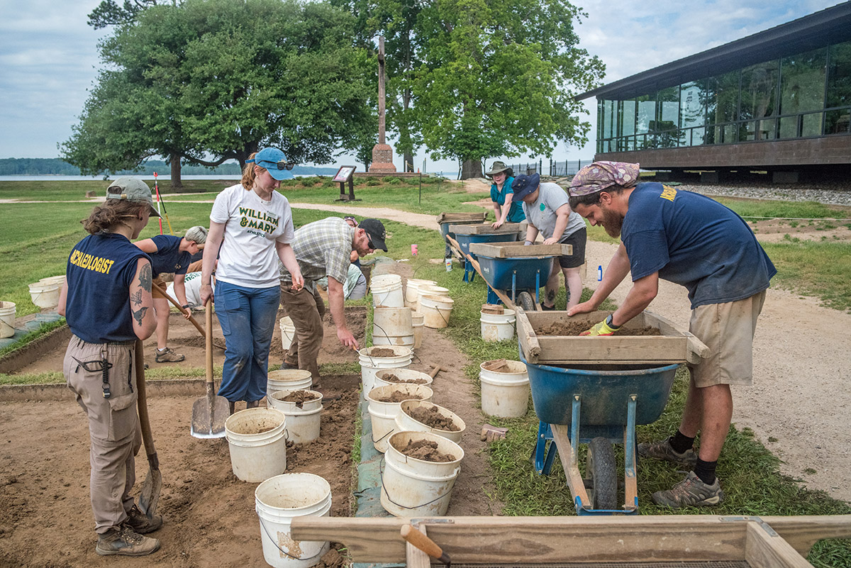 - During one of the staff dig days archaeologists and other Jamestown Rediscovery staff excavate squares just south of the Archaearium.