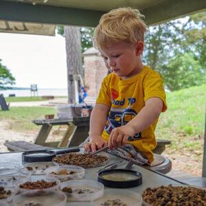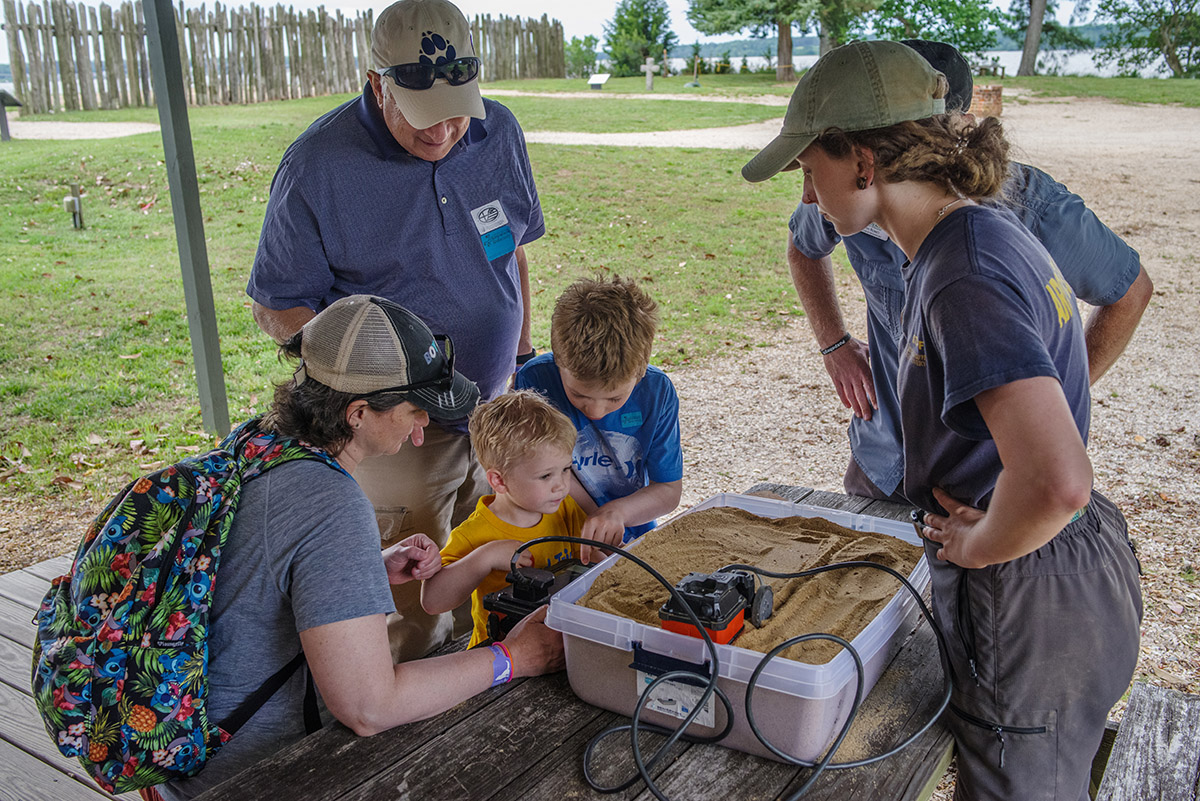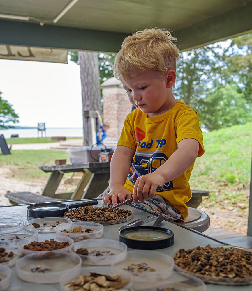 - A young visitor to the Ed Shed looks for artifacts in material excavated from John Smith’s Well.