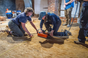 - Director of Archaeology Sean Romo discusses GPR data with his team in the cellar of Bacon’s Castle.