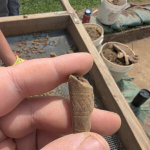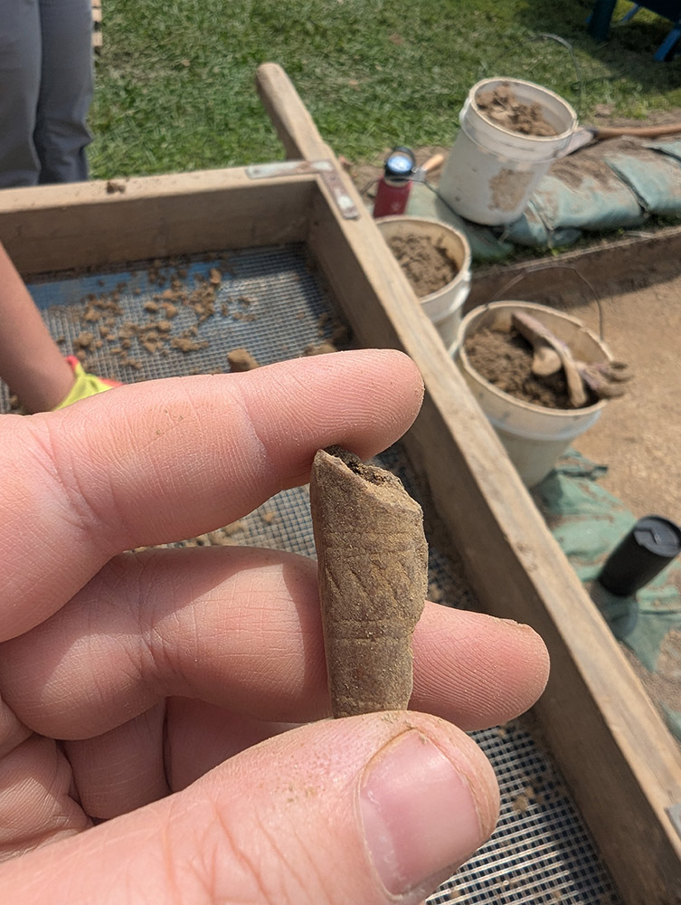 - A partial pipe stem found by Assistant Conservator Jo Hoppe on one of the staff dig days.