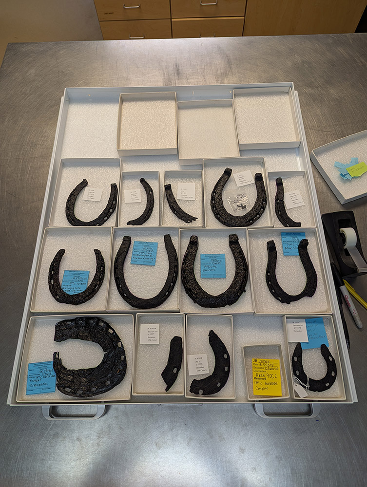 Associate Curator Janene Johnston has now turned her attention to creating a reference collection for Jamestown’s horseshoes. There are about 20 in the collection, including one that was found this spring southwest of the Archaearium. Janene weeded out some pieces of iron that resembled horseshoes but had no nail holes or weren’t whole enough to be positively identified. Those examples found in 17th-century contexts tend to be thinner and exhibit unique characteristics because each was hand-made. They are all conserved and those not on display in the Archaearium will be housed in the Dry Room, where humidity and temperature are monitored and adjusted to inhibit corrosion.