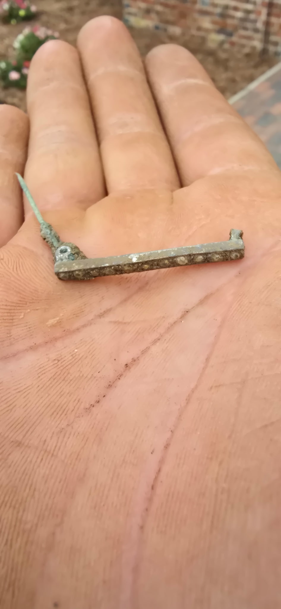 - A decorative copper bar pin found in the excavations outside the Church Tower. It likely dates to the late 19th century.