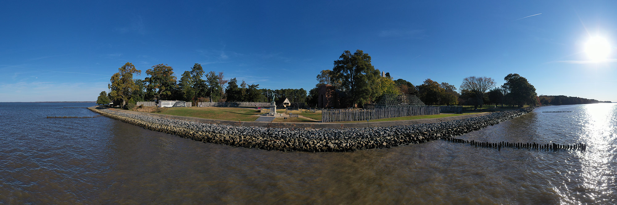 - A drone shot of James Fort from the James River