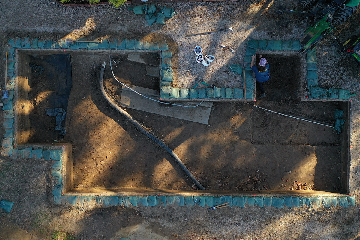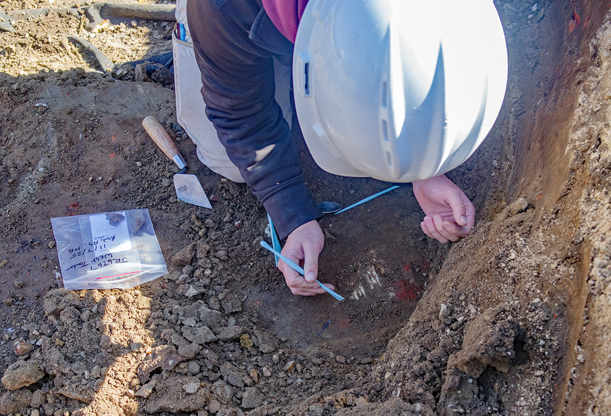 - Staff Archaeologist Caitlin Delmas conducts a ground-penetrating radar (GPR) survey of the area just west of the Archaearium.