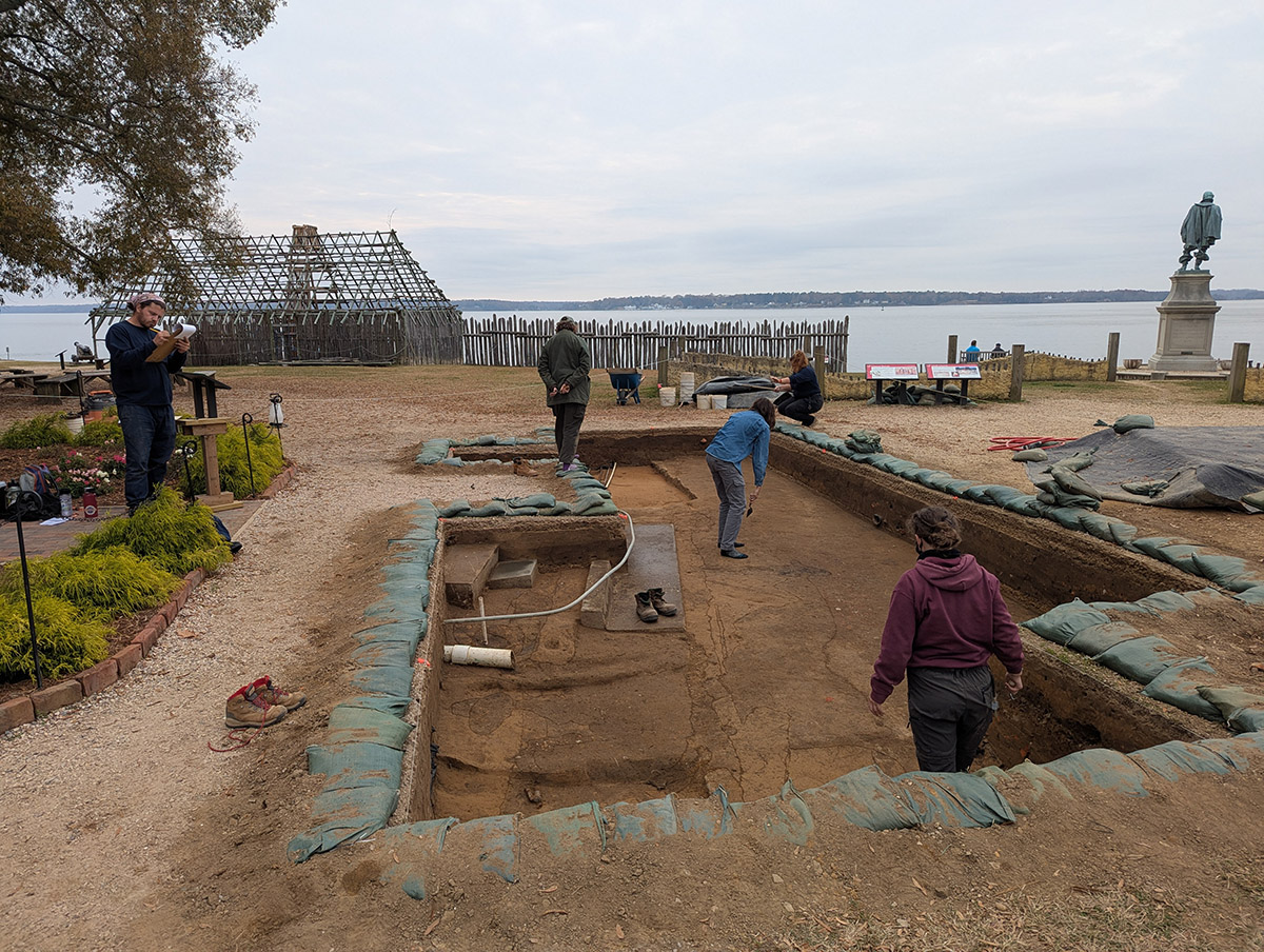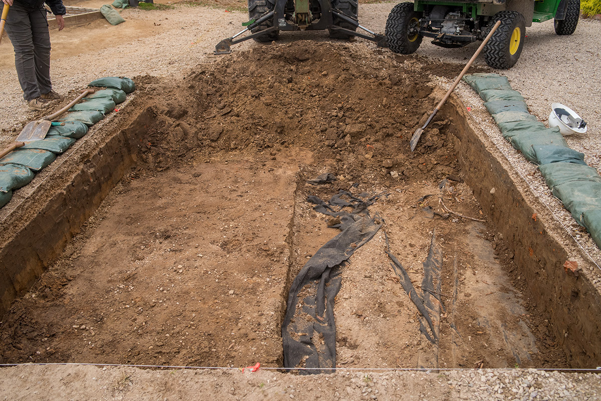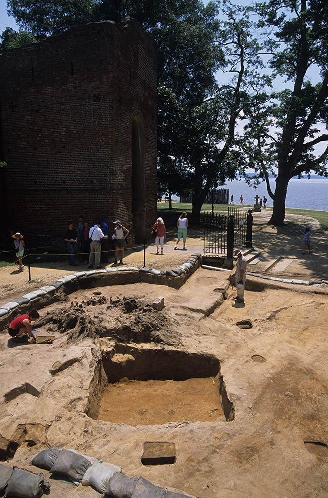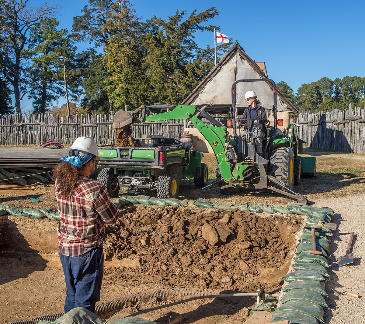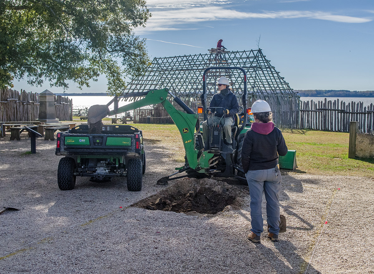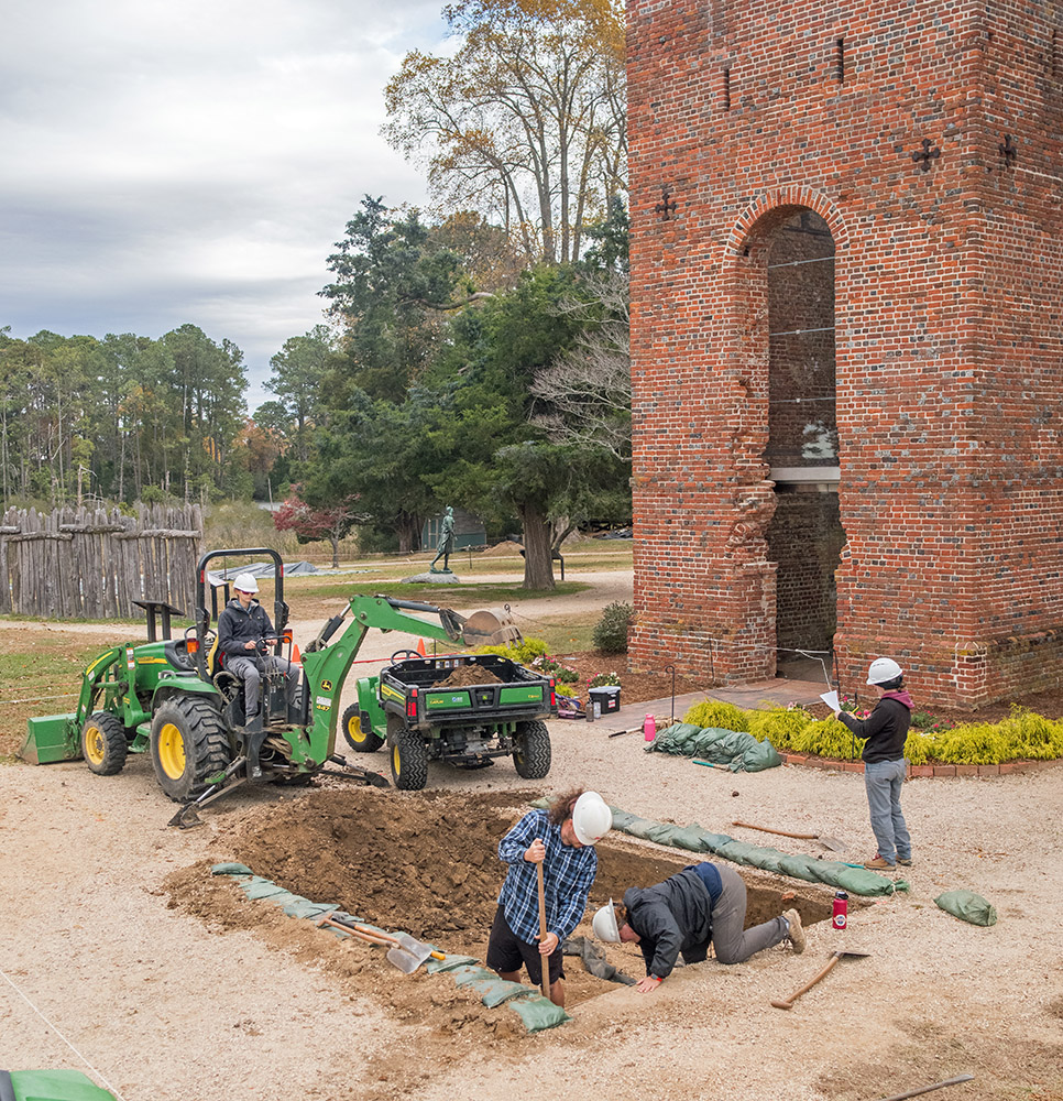 - Senior Staff Archaeologist Anna Shackelford uses a backhoe to begin the excavations just outside the Church Tower as Staff Archaeologist Ren Willis looks on.