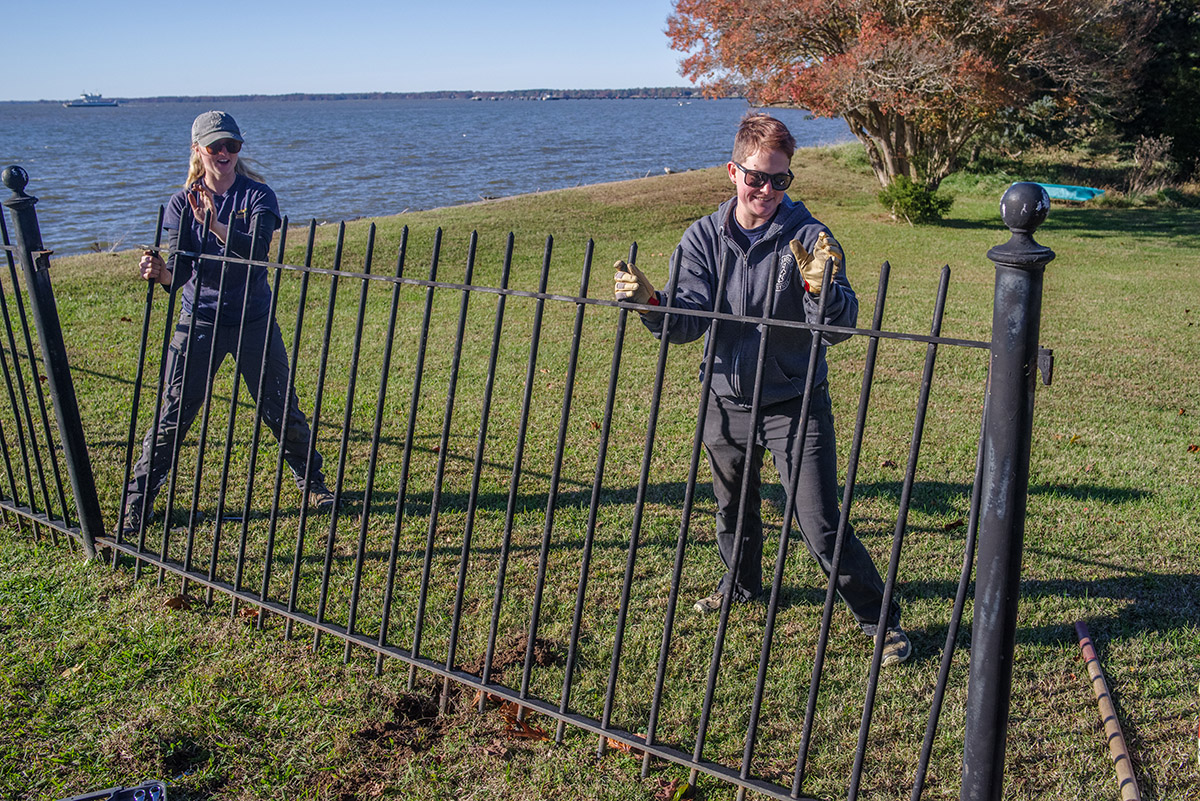 - Staff Archaeologist Caitlin Delmas and Archaeological Field Technician Katie Griffith disassemble the fence surrounding the Statehouse foundations in order to prepare for ground-penetrating radar (GPR) surveys of the area.