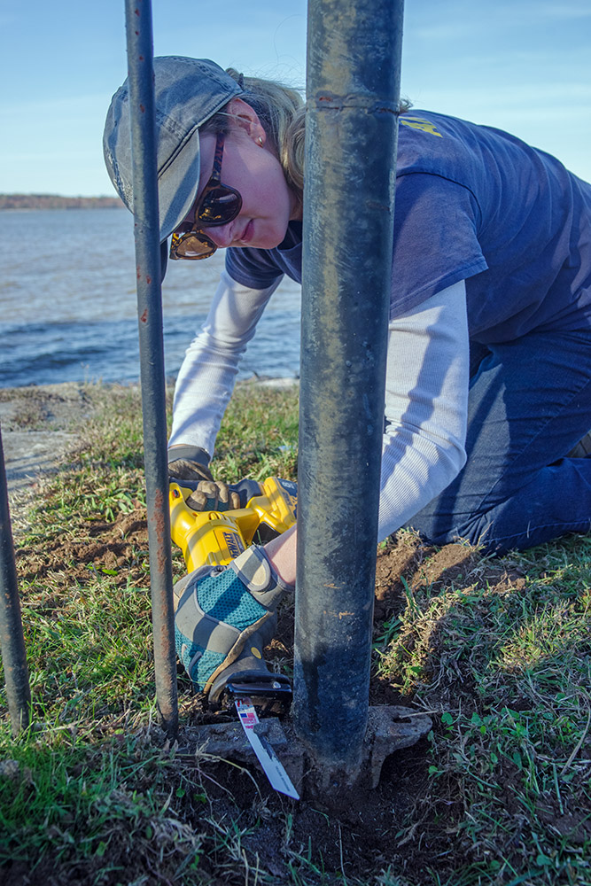 - Archaeological Field Technician Katie Griffith uses a reciprocating saw to remove a stubborn bolt during the disassembly of the fence surrounding the Statehouse remains.