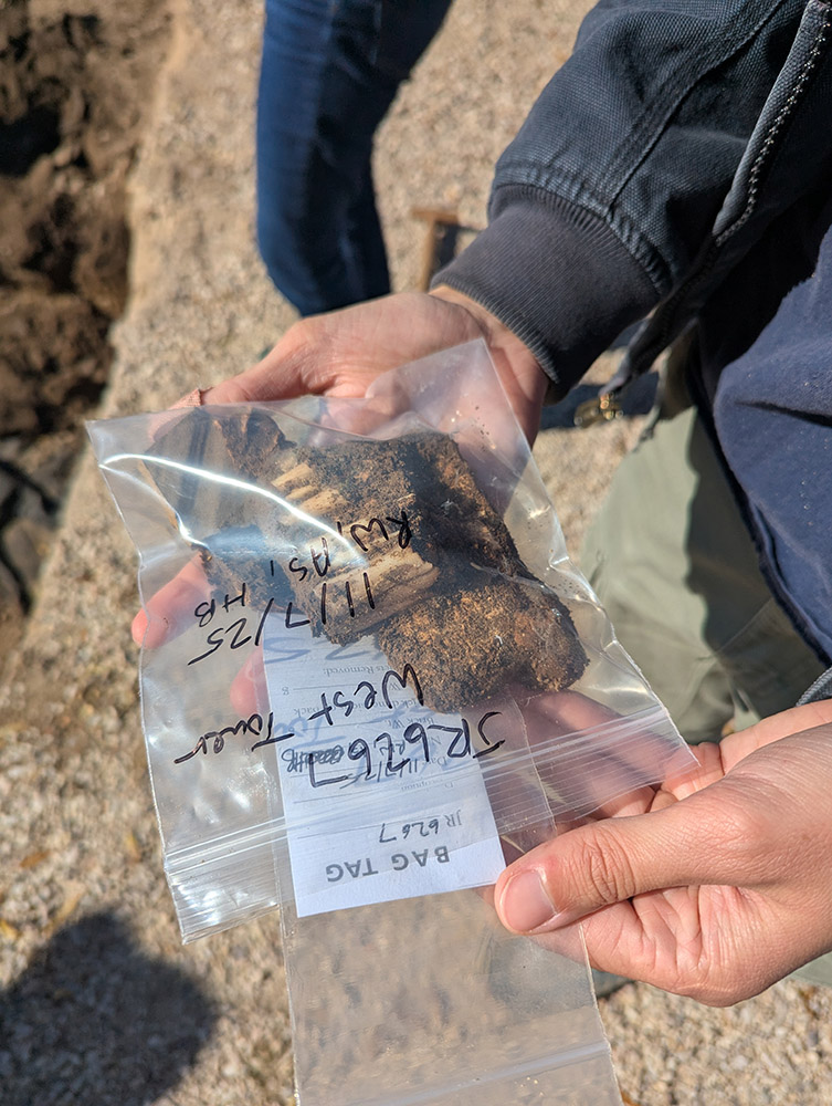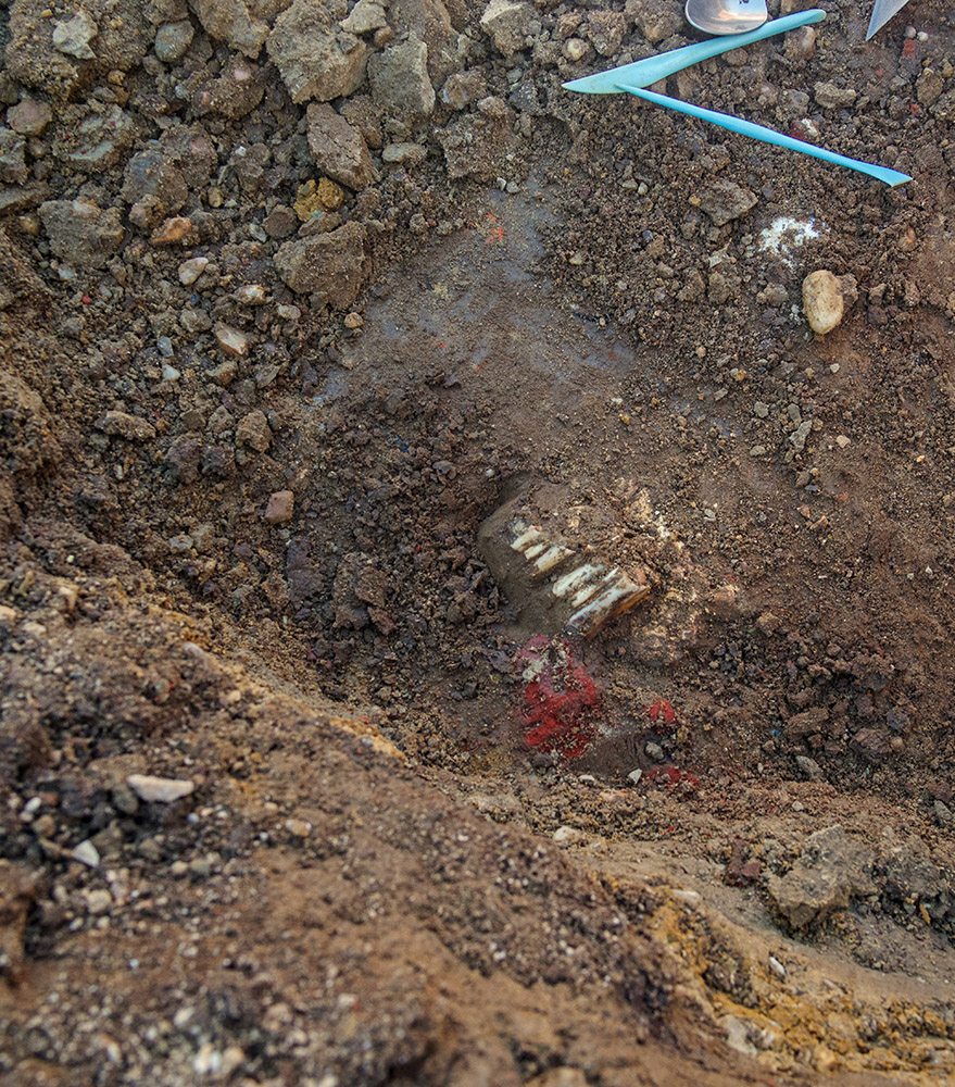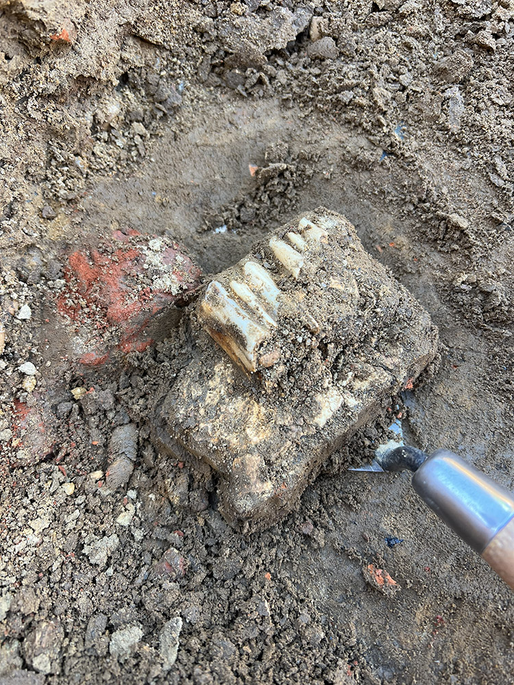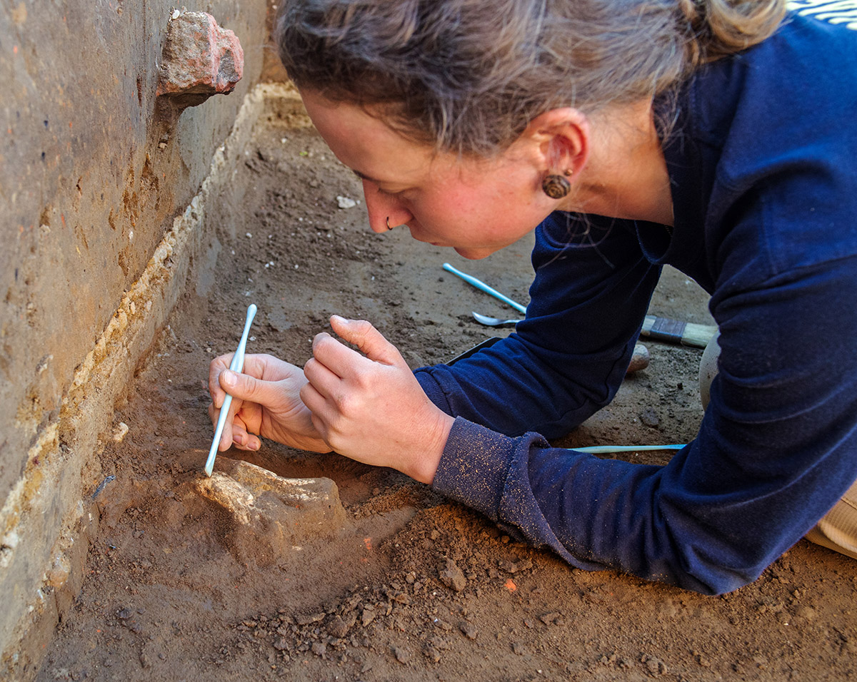 - Staff Archaeologist Ren Willis excavates a mammal bone found in the excavations outside the Church Tower.