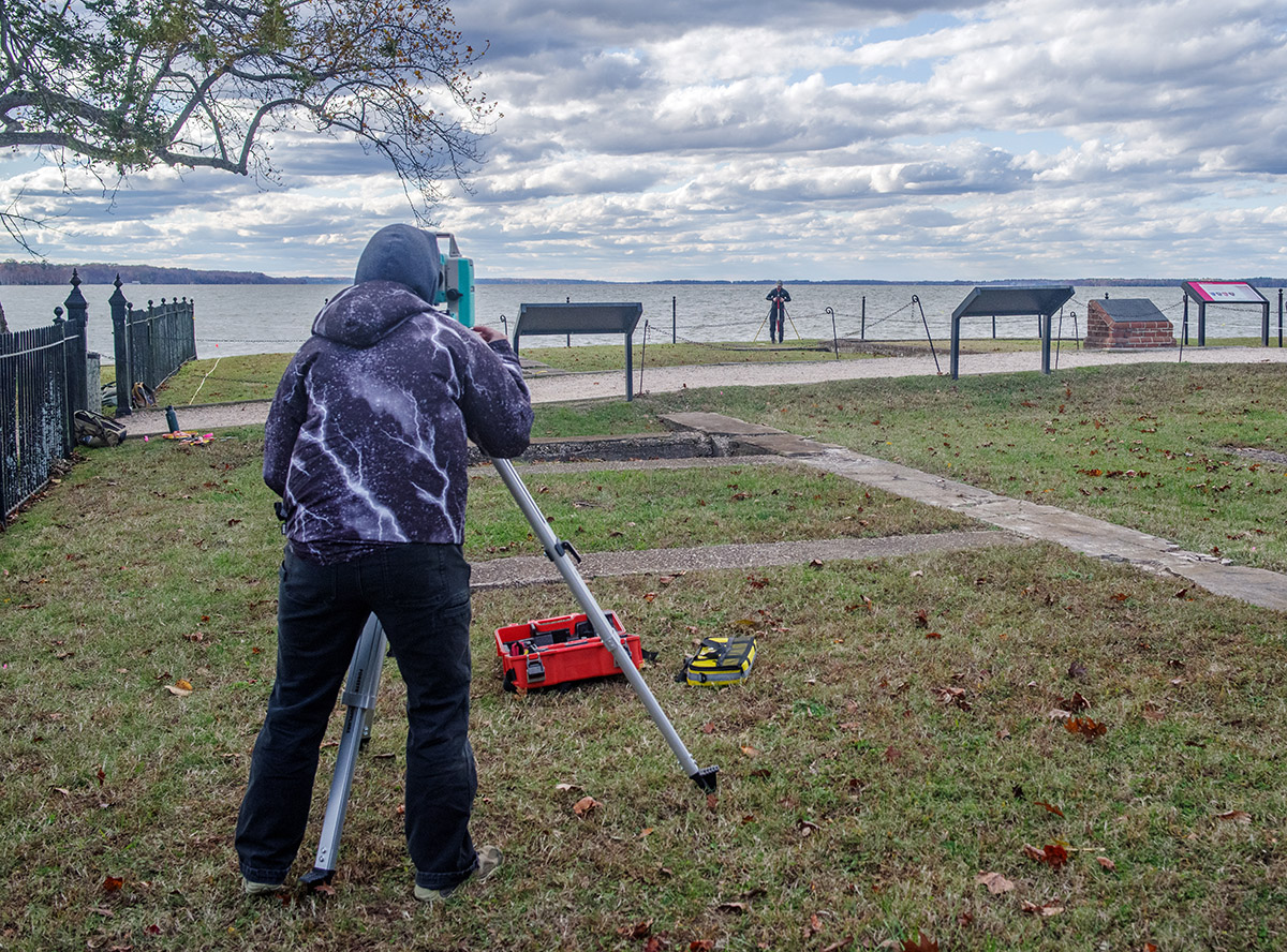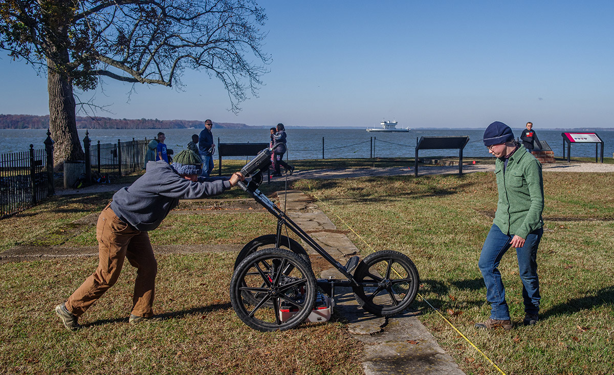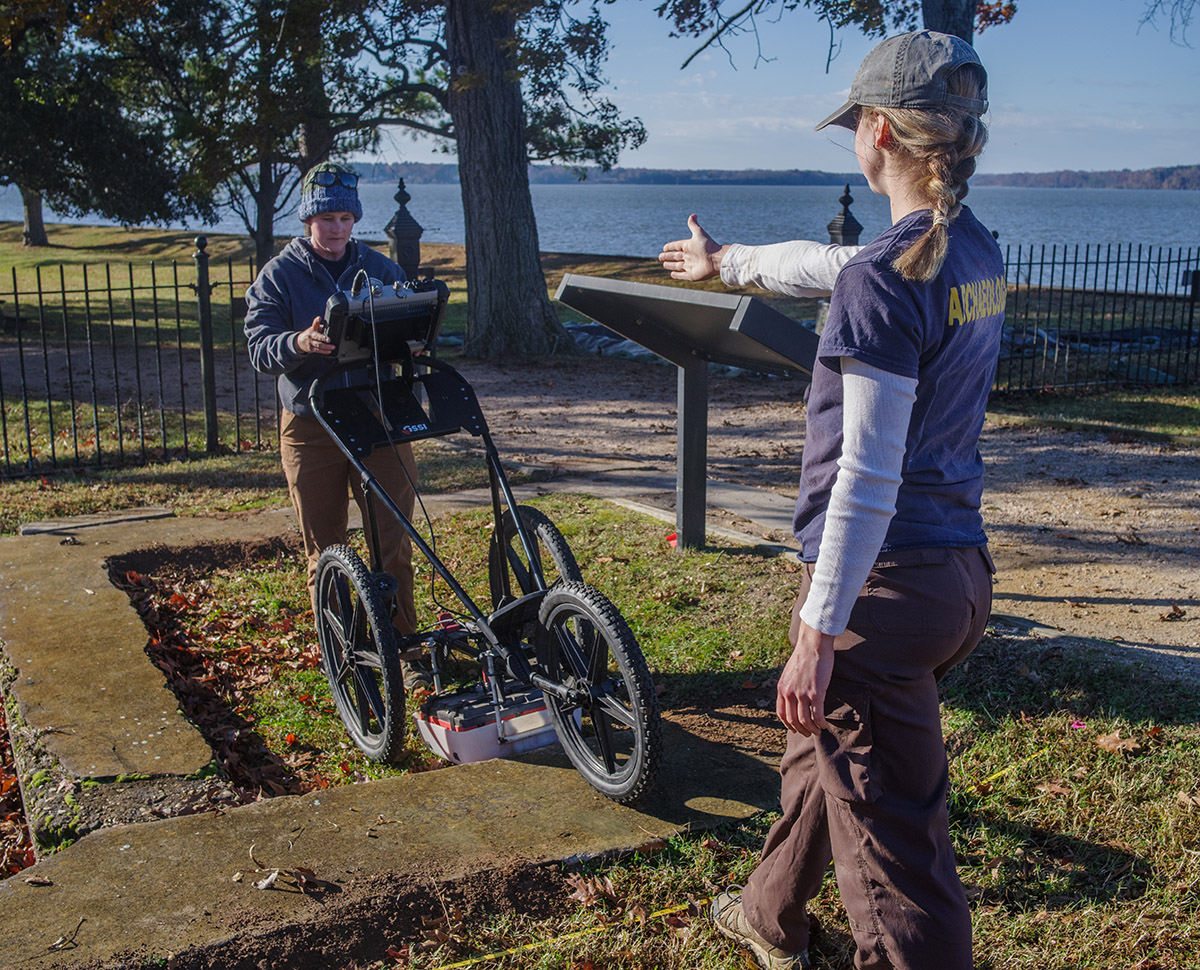 - Staff Archaeologists Caitlin Delmas and Natalie Reid conducting a ground-penetrating radar survey of the Statehouse area.