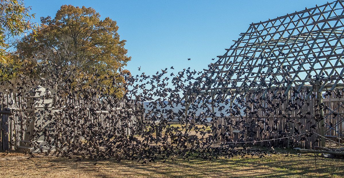- A flock of birds near the barracks inside James Fort