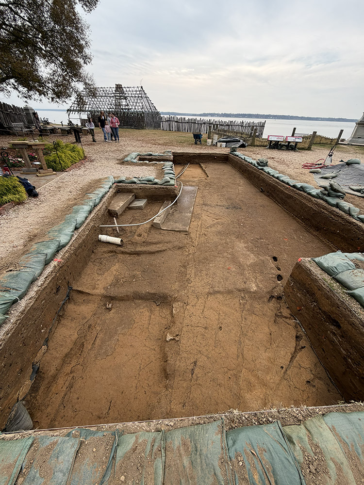 Fort Pocahontas also left its mark here. The team thinks they have found the extreme eastern edge of the Confederate fort, which is an indicator of just how much of the 1607 fort’s archaeological footprint was covered by the 1861 fort’s earthworks. The team has also found soil layers that relate to the construction of a small road that passed right in front of the church. A number of thin scars in the soil here may be evidence of wagon wheel ruts. Because the excavation area is being shaped by the needs of the construction efforts, the outline of the dig is a bit unorthodox, being an asymmetrical mix of ten foot and five foot squares. A copper straight pin, mammal teeth and bones, and a decorative copper bar pin likely dating to the late 19th century are among the artifacts found in these excavations so far.