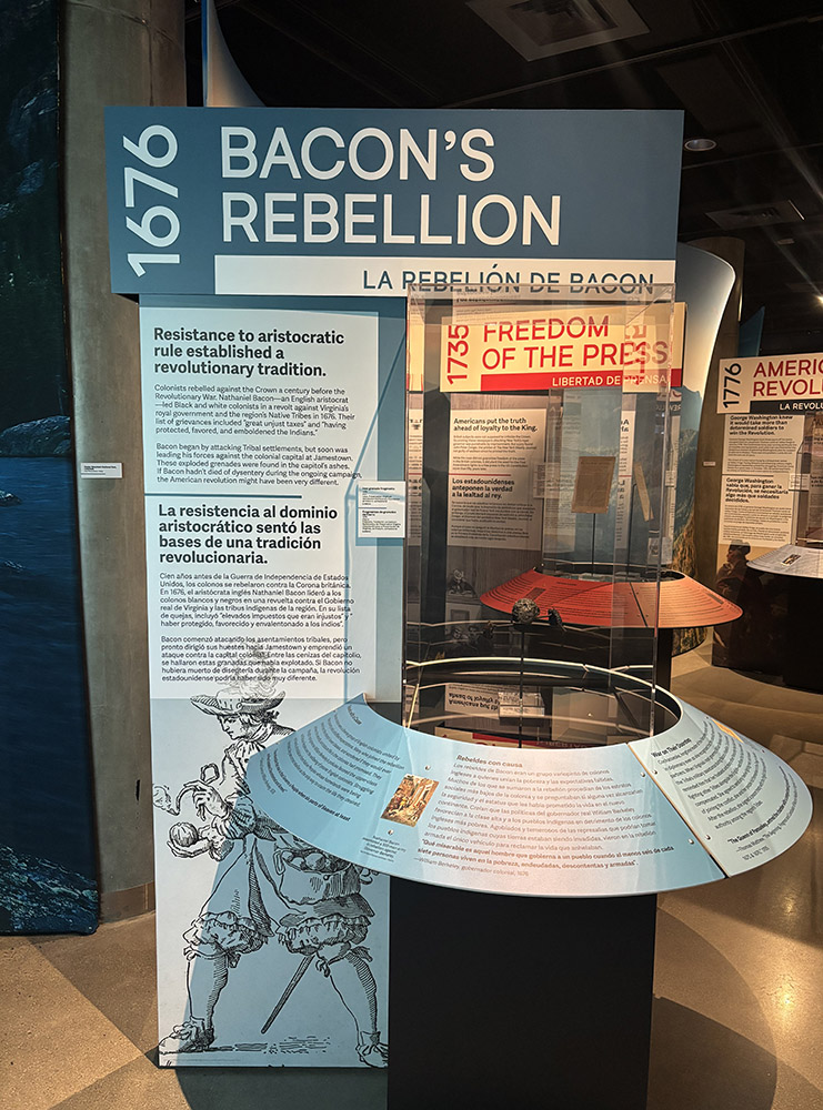 In October, Senior Curator Leah Stricker transported artifacts from the Jamestown collection to the History Colorado Center in Denver. A new exhibit entitled “Moments that Made US”, which opened November 21, includes 5 artifacts from Jamestown: two Robert Cotton pipes, and three grenade fragments. The pipes speak to the importance of tobacco to the success of Virginia and thus to the United States. Robert Cotton was a Jamestown colonist whose distinctive diamond-shaped fleur-de-lis stamp was impressed on his pipes. Using Virginia clay and a form that was closer to Virginia Indian pipes than European ones, he also used printer’s type to impress the names of Virginia Company of London leaders on some of his pipes. The exploded grenade fragments, found during excavations in and around the footprint of the Statehouse, are likely evidence of Bacon’s Rebellion, when on September 19, 1676 Nathaniel Bacon and his men attacked the Statehouse and other buildings, burning Jamestown to the ground. The exhibit is timed to coincide with the 150th anniversary of Colorado’s statehood and the 250th anniversary of the founding of the United States.