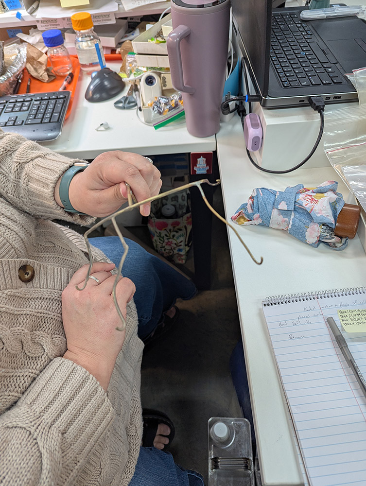 Thanks to the work of curatorial intern Molly Morgan, the mending is complete on a Potomac Creek ceramic jar previously on display in the Archaearium museum. The partial vessel is substantially more complete and in a case of a problem that’s good to have, the existing mount is no longer sufficient to support the expanded pot. As a result, Lauren has amended the mount with two new arms, soldered to it to support the new sections. The improved pot will soon be back on display for our visitors.