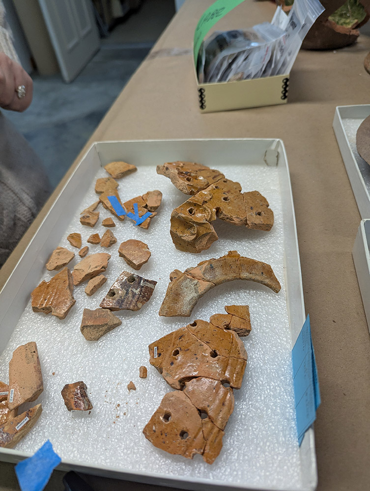 Sorting the artifacts from the Seawall excavations led to the discovery of additional sherds of a Border ware fuming pot. The pot, the only one in the Jamestown collection, was manufactured in the border region between the counties of Surrey and Hampshire, England. Similar to today’s incense burners, herbs or fragrant wood was burned to mask bad smells, with the pot’s holes allowing the gases to escape and fill the room. Other pieces of the vessel have been found in the Powder Magazine, an early fort-period feature, layers associated with a midden, and Ditch 6, a later 17th-century feature found east of Memorial Church that may have been used as a property boundary. Lauren is mending the newly-found pieces. Hopefully future excavations will unearth additional sherds so our collections staff can continue to make the vessel more complete.