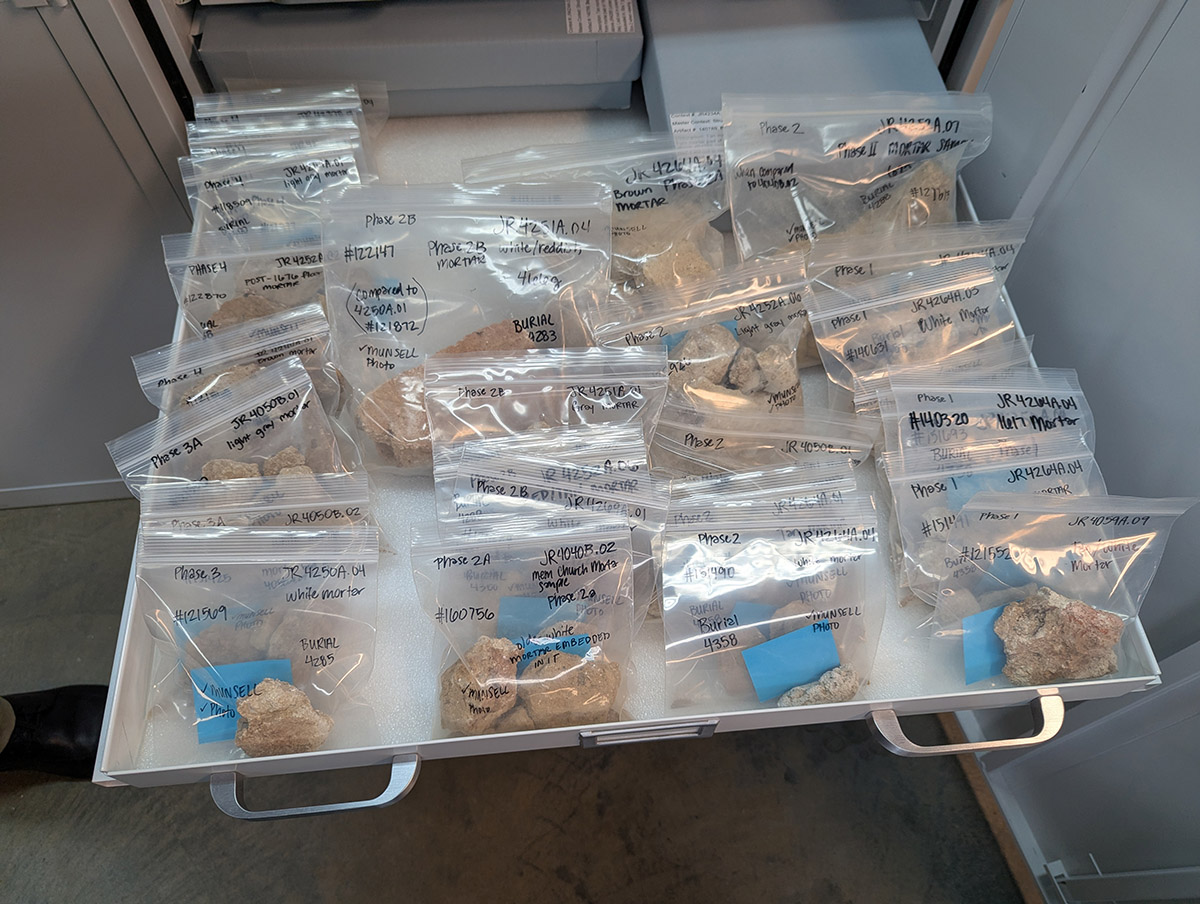 This drawer of the architectural reference collection is categorized into four phases (1617-1639, 1639-1647, 1647-1676, and 1676-1758) that align with the dates of Jamestown’ churches and seminal events in the town’s life. Reference collections contain unique or representative examples of artifact types and are housed downstairs in the Vault for easy access to researchers. Should a researcher need to examine additional examples, these can then be pulled and brought downstairs. The most frequent users of the reference collection are our own staff, who use it to identify artifacts while they are cataloging. Housing the rest of the artifacts upstairs saves valuable room below where the team does the majority of their work.