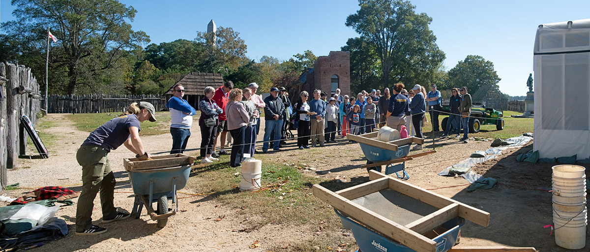 - Archaeological Field Technician Hannah Barch describes the 1607 Burial Ground excavations to visitors on an archaeology tour. Archaeological Field Technician Katie Griffith screens for artifacts at left.
