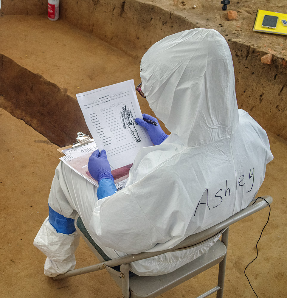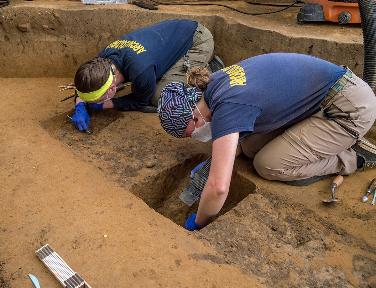 - Director of Archaeology Sean Romo and Archaeological Field Technician Eleanor Robb excavate the top layers of the Smithfield burial.