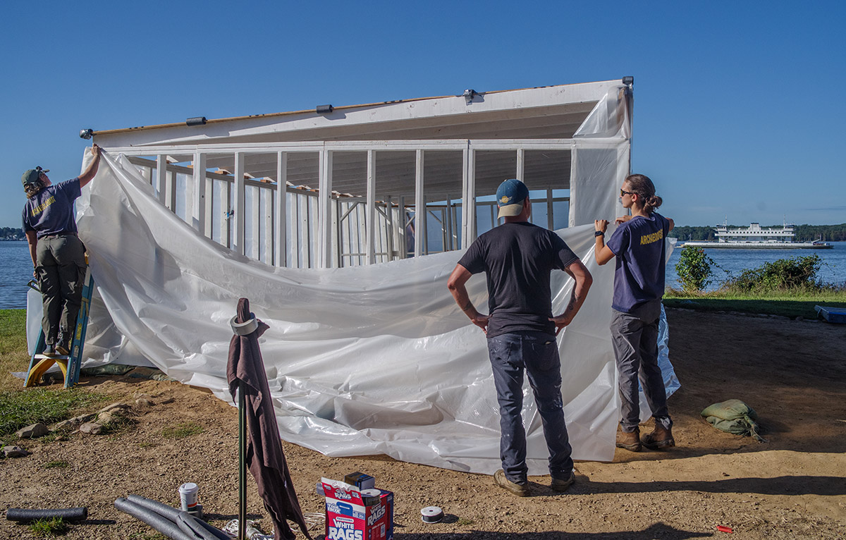 - Archaeological Field Technician Josh Barber, Staff Archaeologist Ren Willis, and Senior Staff Archaeologist Anna Shackelford build a roof for the burial structure at the 1607 Burial Ground.