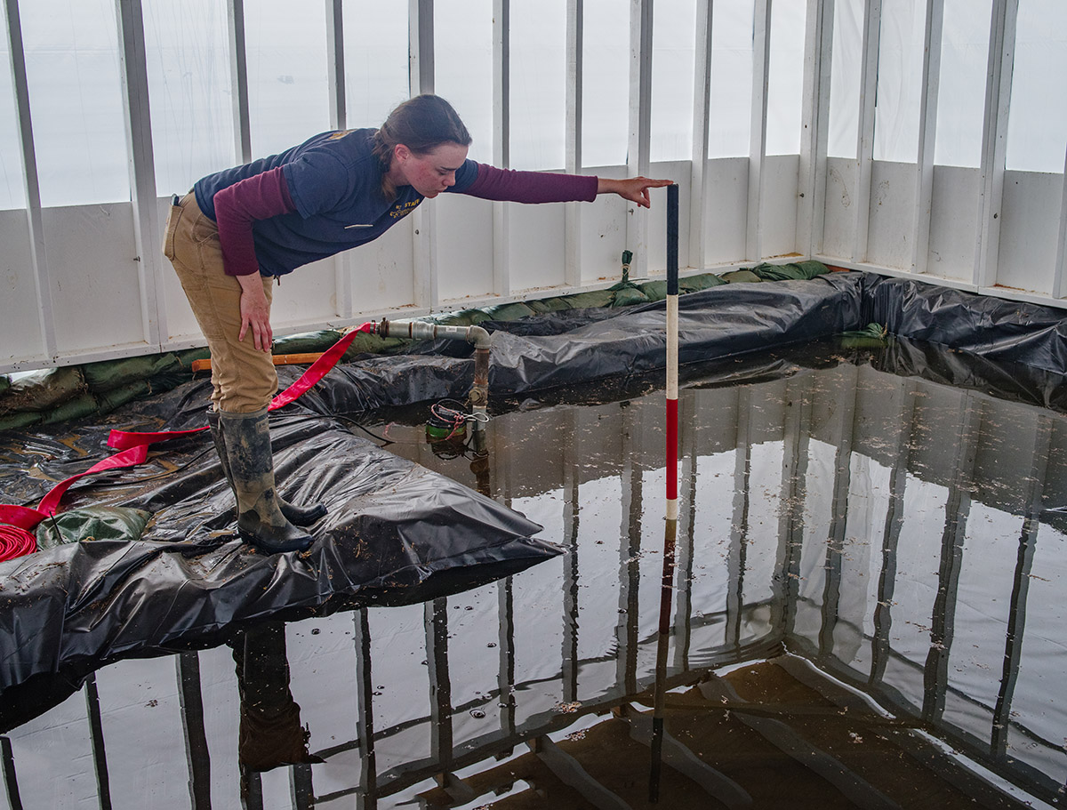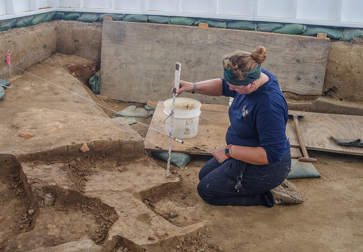 - Archaeological Field Technician Hannah Barch double checks her elevation inside of the 1607 Burial Ground structure.
