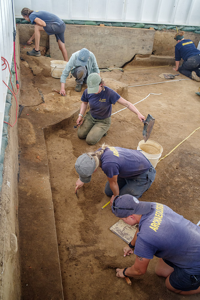 - While some of the crew conduct excavations, other archaeologists combine building sections to construct the burial structure at the 1607 Burial Ground.