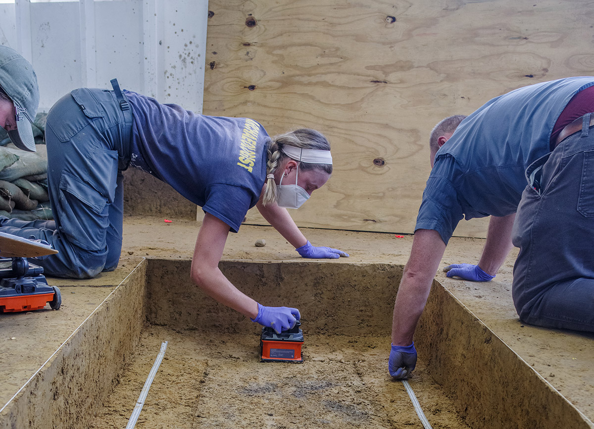 - Archaeological Field Technician Eleanor Robb, Staff Archeologist Gabriel Brown, and Senior Staff Archaeologist Anna Shackelford install plastic sheeting on the burial structure at the 1607 Burial Ground.