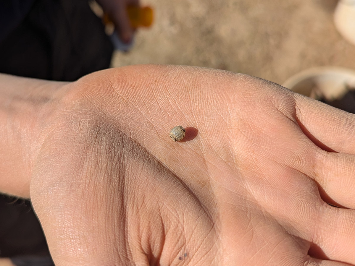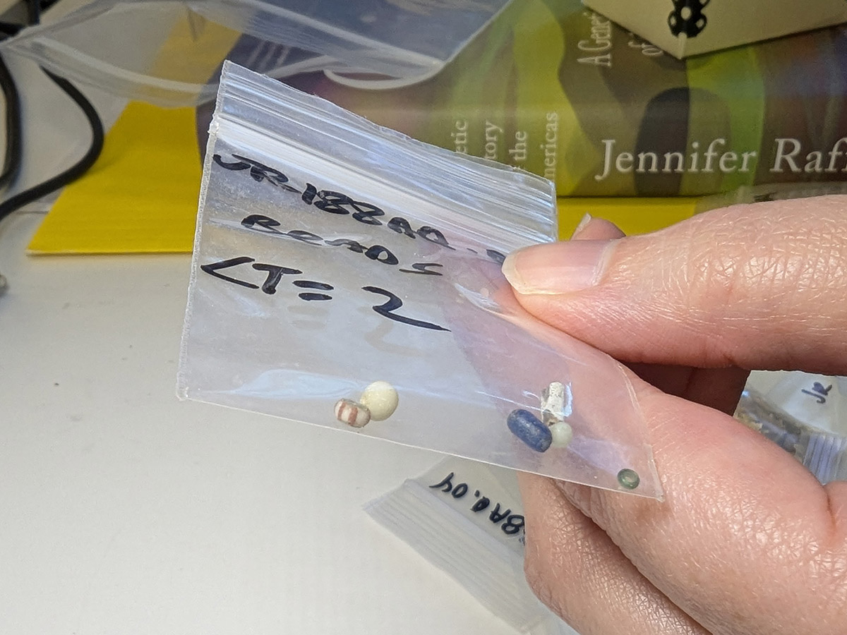 - Archaeological Field Technician Katie Griffith holds a gooseberry bead she found while screening soil from the 1607 Burial Ground.