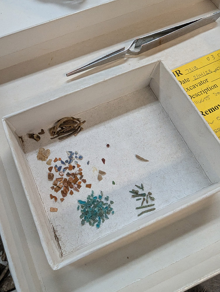 Collections Assistant Lindsay Bliss is sorting samples taken in 2023 from the Governor’s Well and floated in the summer months. Of particular interest in the light fraction, or material that floated to the surface during the flotation process, are seeds and other botanicals. Lindsay has identified many Blueberry seeds as well as possible amaranth and strawberry seeds, highlighting that the colonists were consuming locally available plant foods.