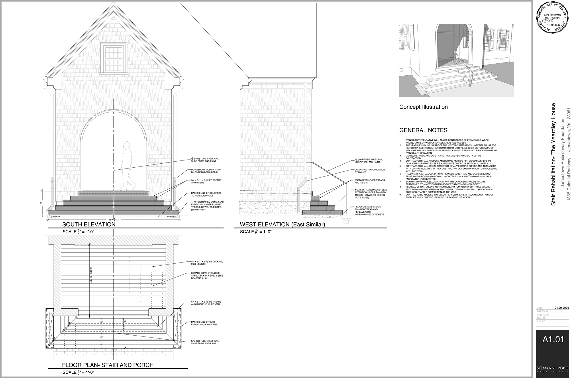 Preservation Virginia’s Jamestown Rediscovery Foundation (JRF) seeks professional services to improve access to the historic Yeardley House. Current concrete steps to the building’s front entrance are irregular and not up to current code. Jamestown Rediscovery is requesting a skilled, licensed and insured contractor to construct stairs atop the existing concrete using the architectural plans provided in this RFP. These plans have been through architectural review and construction should not deviate without written approval from Jamestown Rediscovery and Stemann|Pease Architecture. On-site construction is expected to be less than 30 days and project completed by April 24, 2026.
