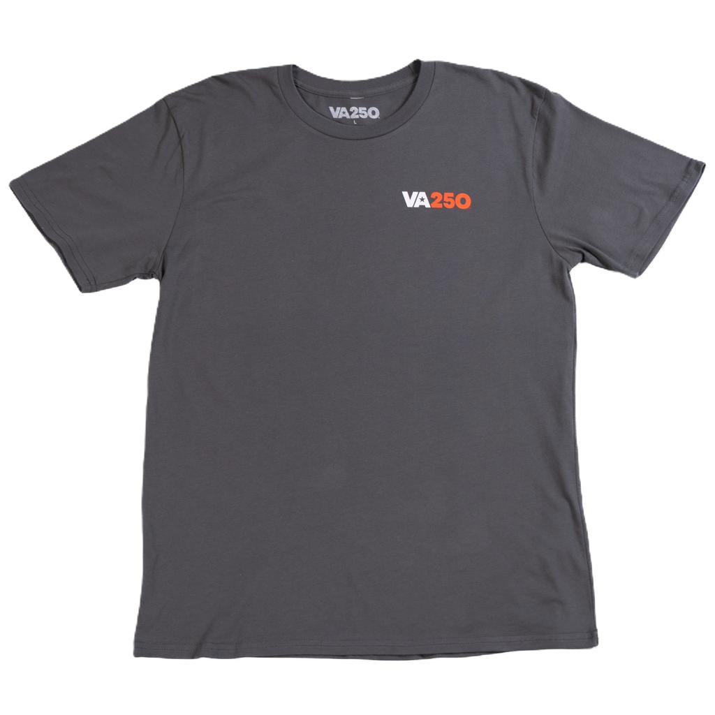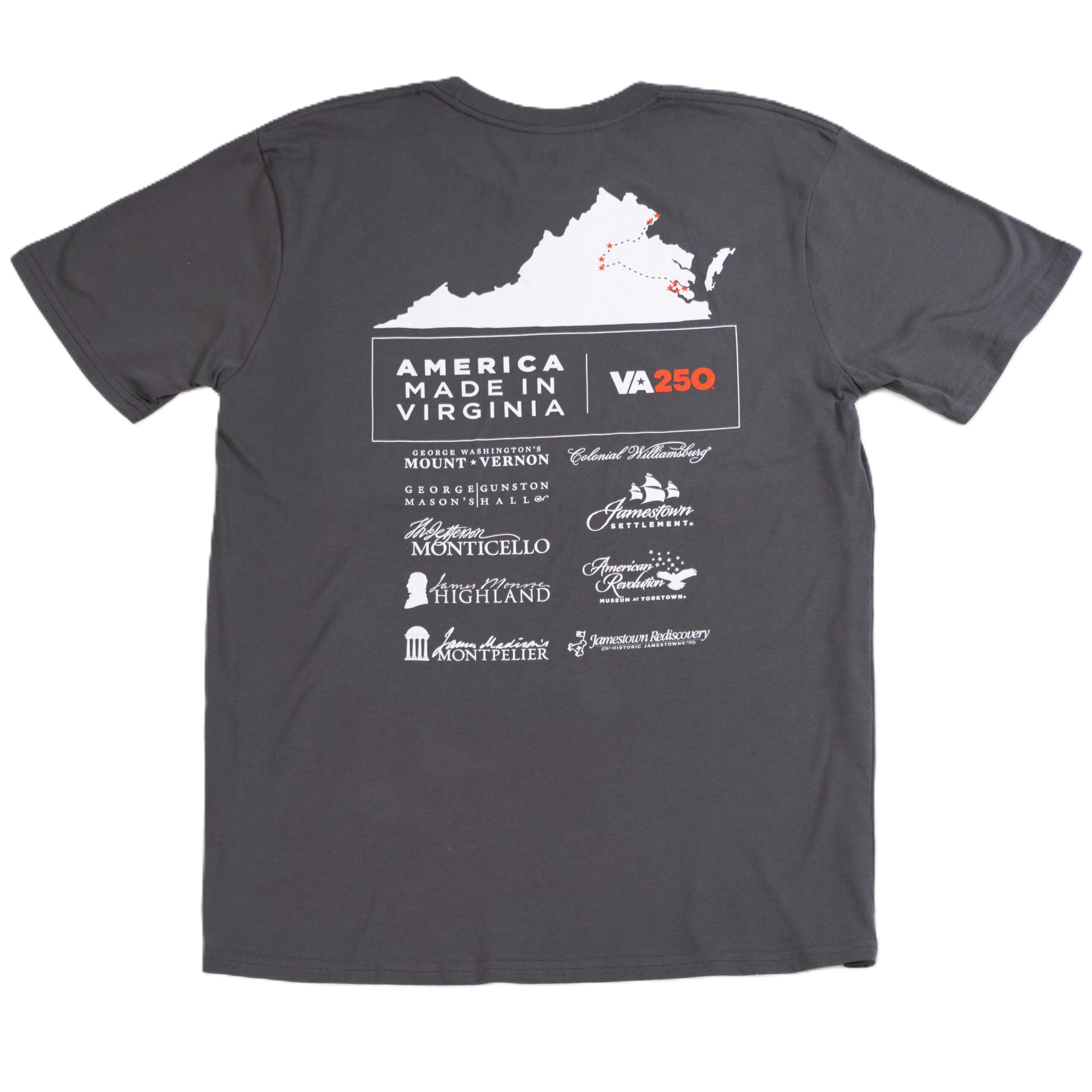 Designed for the nation’s Semiquincentennial, this tee is printed in a road trip design, depicting travel to each of the 9 Historic Museums on one side and the VA250 Logo on the other side. 100% cotton. This tee is made in the USA. Color is graphite grey.