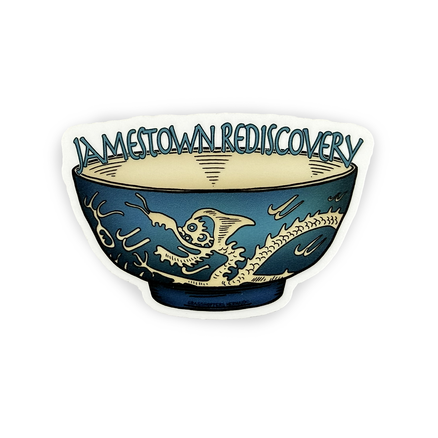 This hand-drawn sticker is designed after our Dragon bowl fragment, also featured in Following the Dragon: Late Ming Porcelain From James Fort, Jamestown, Virginia shows a dragon chasing a flaming pearl, and it is one of only two such bowls known in the world! In Chinese mythology, dragons were divine creatures that symbolized strength and good fortune; the flaming pearl represented wisdom.