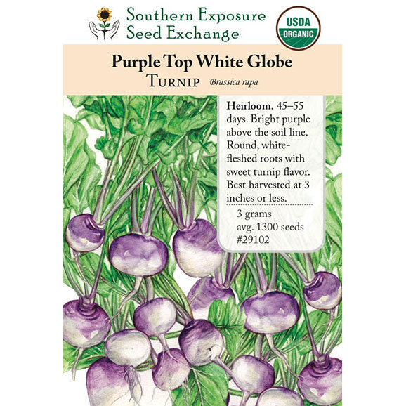 Heirloom. 45-55 days. Bright purple above the soil line. Round, white-fleshed roots with sweet turnip flavor. Best harvested at 3 inches or less.