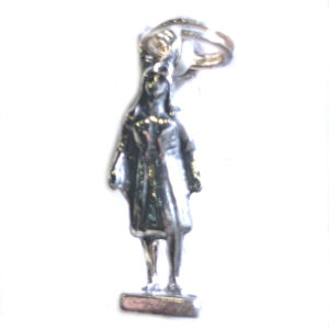 This is a pewter imitation of a spiritual object found in an early James Fort feature. The original was made of jet, a black fossil resin believed to have magical and protective properties. At the time of Jamestown’s settlement, a major source of this mineral was Whitby in the north of England. The reproduction we sell here is made with pewter with the same size, shape, and engraving.